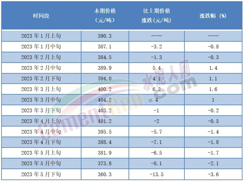 5月15日前后,长三角沿江区域主要品牌水泥价格通知下调15~20元/吨。下调后,海螺水泥多家工厂出厂价跌破300元/吨,江苏沿江区域装船价,杨湾海螺报290元/吨、盘景水泥报270元/吨、金峰水泥报275元/吨、鹤林水泥报280元/吨;装车价,江苏磊达报295元/吨、金峰水泥报290元/吨。区域内主要品牌企业车运挂牌价P.O42.5水泥报355元/吨,PO52.5水泥报价385元/吨。
