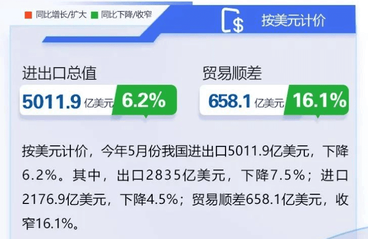 事实上,光伏行业的出口受到压制只是近期国内外贸行业的一个缩影,多方的制裁和约束,也让国内的外贸企业走入更深的困境。据海关统计,今年5月份,我国进出口3.45万亿元,增长0.5%。其中,出口1.95万亿元,下降0.8%;按美元计价,今年5月份我国进出口5011.9亿美元,下降6.2%。其中,出口2835亿美元,下降7.5%。贸易顺差658.1亿美元,收窄16.1%。