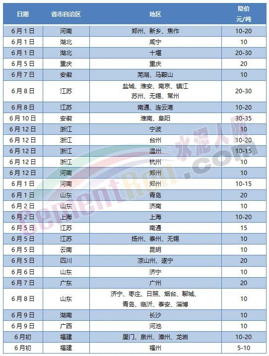 据市场反馈,进入6月因中高考、农忙及高温雨季影响,部分工地施工进度放缓。多区域主要品牌企业出货量锐减,加之外来低价水泥冲击,部分区域甚至出现一日一跌的情形。