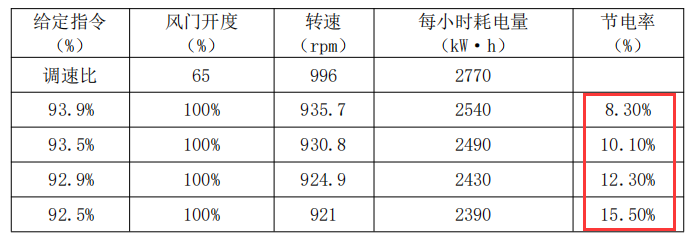 相较于工频转速,65度风门开度节电率约为15.5%。