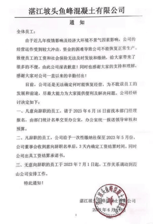 日前,广东湛江坡头鱼峰混凝土有限公司发通知给员工称,由于近几年疫情影响及经济大环境不景气因素影响,公司的经营运作受到较大冲击,资金的困难导致公司不能恢复正常生产,致使员工的工资和社会保险无法及时发放和缴纳。目前,公司无法确定何时能恢复经营,为不耽误员工的发展和前途,为员工提供了离职与调动方案。