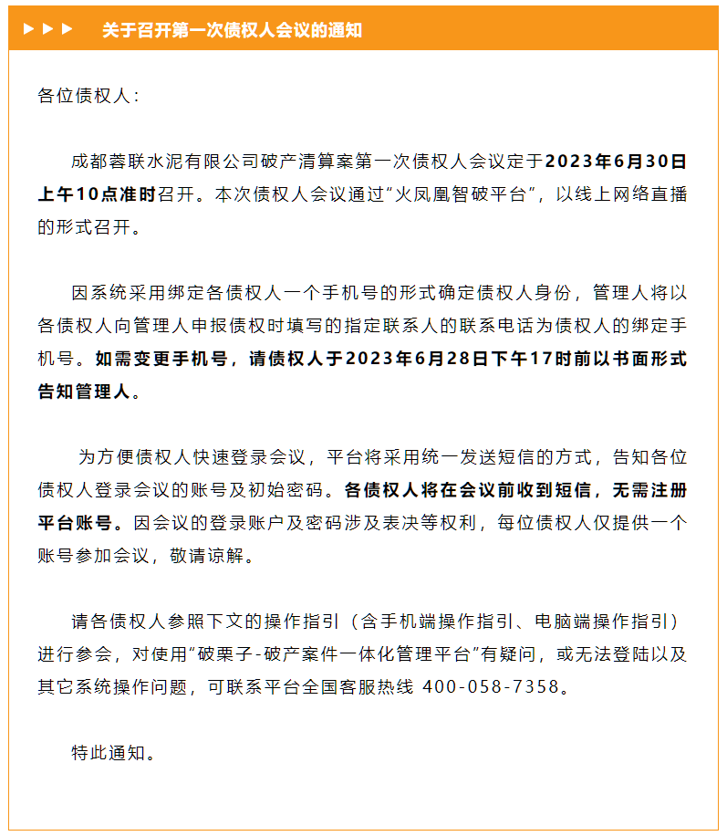 6月21日,双流法院微发布微信公众号发布《成都蓉联水泥有限公司破产清算案第一次债权人会议通知及操作指引》提到,成都蓉联水泥有限公司破产清算案第一次债权人会议定于2023年6月30日上午10点准时召开。