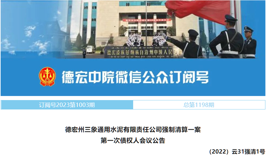 6月19日,德宏中院发布《德宏州三象通用水泥有限责任公司强制清算一案第一次债权人会议公告》称,定于2023年6月28日上午9时30分以网络会议形式召开德宏州三象通用水泥有限责任公司第一次债权人会议。