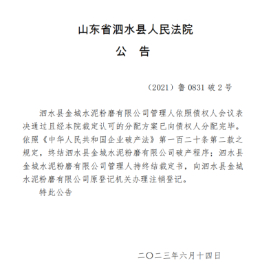 6月14日山东省泗水县人民法院发布公告称,泗水县金城水泥粉磨有限公司管理人依照债权人会议表决通过且经本院裁定认可的分配方案已向债权人分配完毕。依照《中华人民共和国企业破产法》相关规定,终结泗水县金城水泥粉磨有限公司破产程序;泗水县金城水泥粉磨有限公司管理人持终结裁定书,向泗水县金城水泥粉磨有限公司原登记机关办理注销登记。