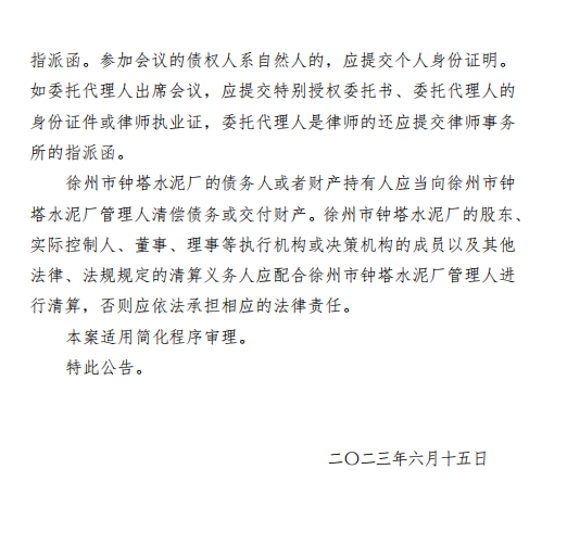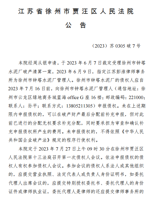 江苏省徐州市贾汪区人民法院公告于2023年6月7日裁定受理徐州市钟塔水泥厂破产清算一案,2023年6月9日,指定江苏彭淮律师事务所为徐州市钟塔水泥厂管理人。