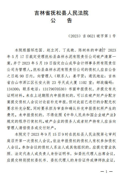 吉林省抚松县人民法院公告于2023年5月17日裁定受理抚松县森祥水泥有限责任公司破产清算一案,并于2023年5月19日指定白山成华会计师事务所有限责任公司为管理人。
