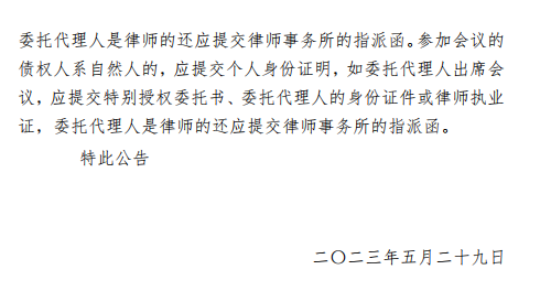 参加会议的债权人是法人或其他组织的,应当提供营业执照、法定代表人或负责人身份证明书,如委托代理人参加的,还应当提供特别授权委托书、委托人身份证或律师执业证,委托代理人是律师的还应提交律师事务所的指派函,并于2023年6月28日上午9点20分登录破易云平台(方式一:手机微信搜索“破易云”小程序,在登录页中输入手机号、获取短信验证码并输入案件识别码:111481,登录参会;方式二:电脑浏览器访问网址https://zqr.poyiyun.com/ 登录后参与会议,本案件识别码:111481)召开德宏州三象通用水泥有限责任公司强制清算案第一次债权人正式会议,本次会议开始前管理人将会议文本上传至破易云平台,请债权人及时登陆破易云平台下载查阅。请各位债权人准时登录系统,点击进入债权人会议,通过网络方式参与会议和投票表决。