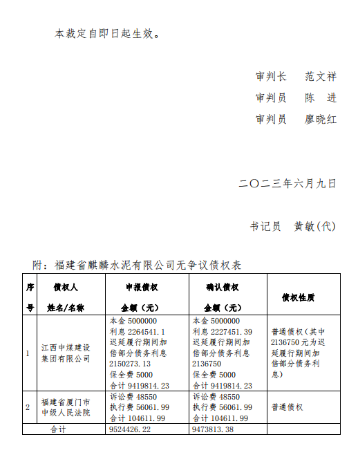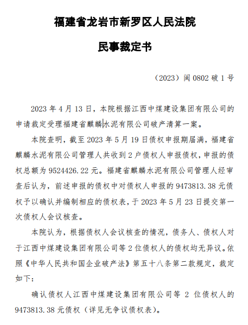 2023年4月13日,福建省龙岩市新罗区人民法院根据江西中煤建设集团有限公司的申请裁定受理福建省麒麟水泥有限公司破产清算一案。法院查明,截至2023年5月19日债权申报期届满,福建省麒麟水泥有限公司管理人共收到2户债权人申报债权,申报的债权总额为9524426.22元。