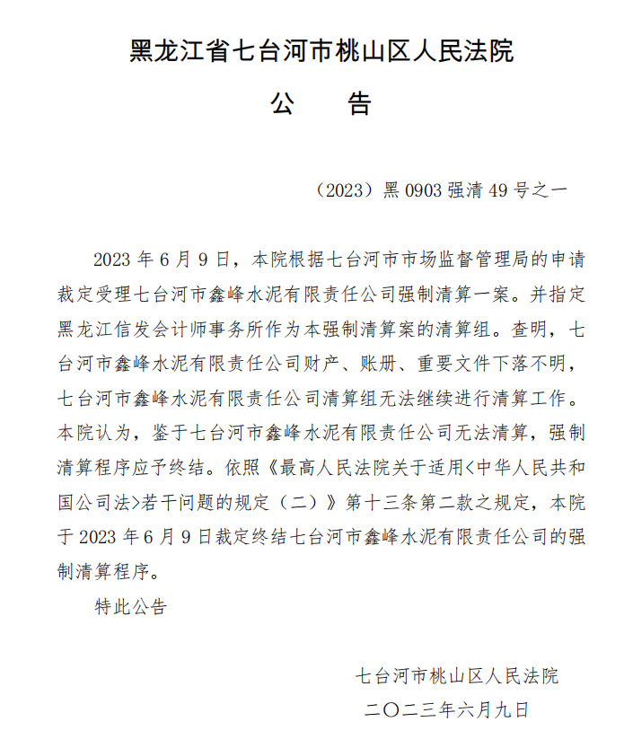 2023年6月9日,黑龙江省七台河市桃山区人民法院根据七台河市市场监督管理局的申请裁定受理七台河市鑫峰水泥有限责任公司强制清算一案。并指定黑龙江信发会计师事务所作为本强制清算案的清算组。