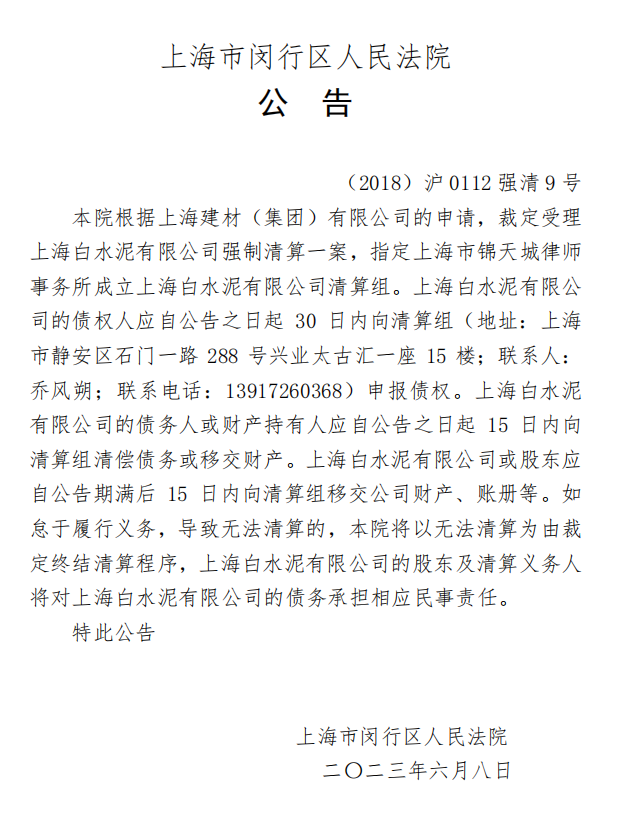 上海市闵行区人民法院公告,根据上海建材(集团)有限公司的申请,裁定受理上海白水泥有限公司强制清算一案,指定上海市锦天城律师事务所成立上海白水泥有限公司清算组。