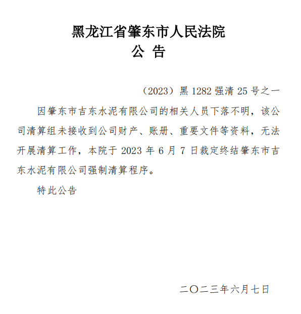 因肇东市吉东水泥有限公司的相关人员下落不明,清算组未接收到公司财产、账册、重要文件等资料,无法开展清算工作,黑龙江省肇东市人民法院于2023年6月7日裁定终结肇东市吉东水泥有限公司强制清算程序。