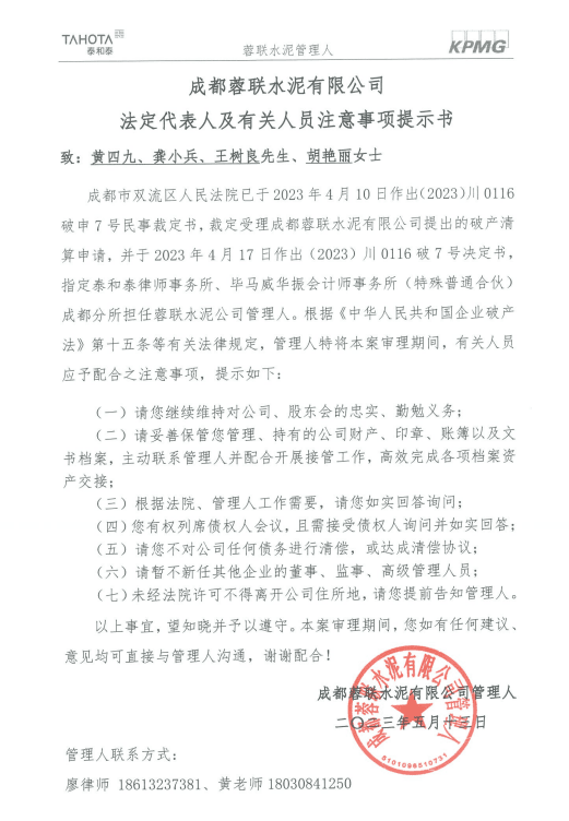 成都市双流区人民法院于2023年4月10日裁定受理成都蓉联水泥有限公司提出的破产清算申请,并于2023年4月17日指定泰和泰律师事务所、毕马威华振会计师事务所特殊普通合伙成都分所担任蓉联水泥公司管理人。