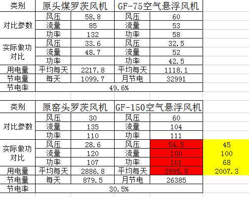 赞皇金隅水泥有限公司对厂中二线头煤罗茨风机、窑头一次风机进行了节能改造,头煤风机换为:GF75-0.6型空气悬浮风机;窑头一次风机换为:GF150-0.6型空气悬浮风机,两种风机参数做功及用电量对比如下表所示: