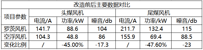 1、头煤空气悬浮风机:根据实际参数对比后累计正常运行41天的用电量,对比后空气悬浮风机节电率为49.6%,达到合同签订要求。