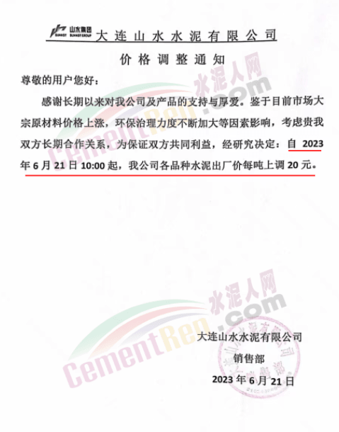 水泥人网通讯员消息:日前大连山水水泥有限公司通知,从2023年6月25日18点开始把系统寄存PO42.5散装水泥价格调整到260元/吨。据了解,这是企业6月21日发函通知上调报价20元/吨的第二次调价,五日内连续两次逆势调价,累计上调40元/吨。