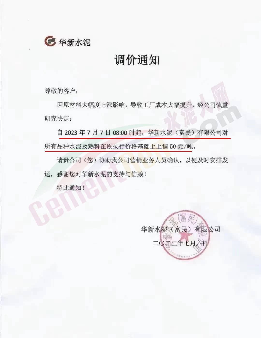 华新水泥(富民)有限公司通知,因原材料大幅度上涨影响,导致工厂成本大幅提升,经公司慎重研究决定:自2023年7月7日8时起,华新水泥(富民)有限公司对所有品种水泥及熟料在原执行价格基础上上调50元/吨。