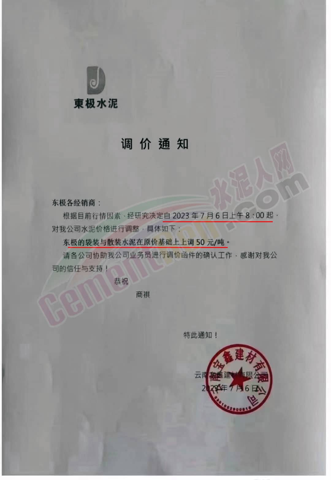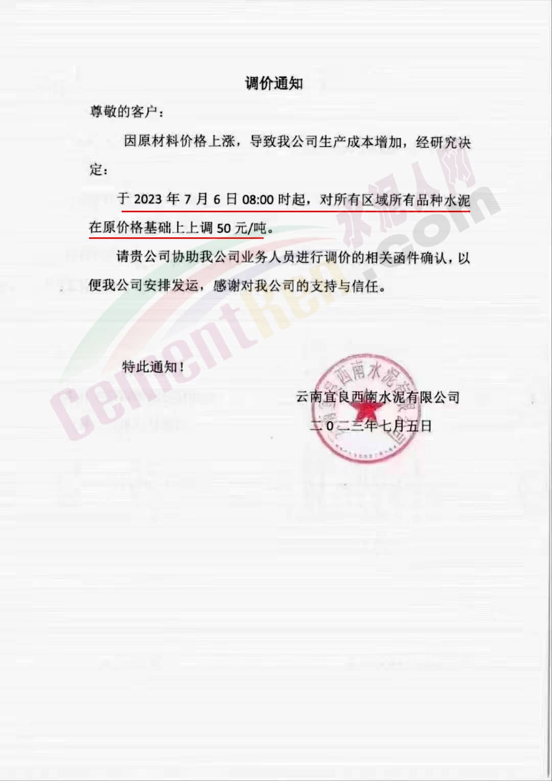 云南宜良西南水泥有限公司通知,因原材料价格上涨,导致公司生产成本增加,经研究决定:于2023年7月6日8时起,对所有区域所有品种水泥在原价格基础上上调50元/吨。