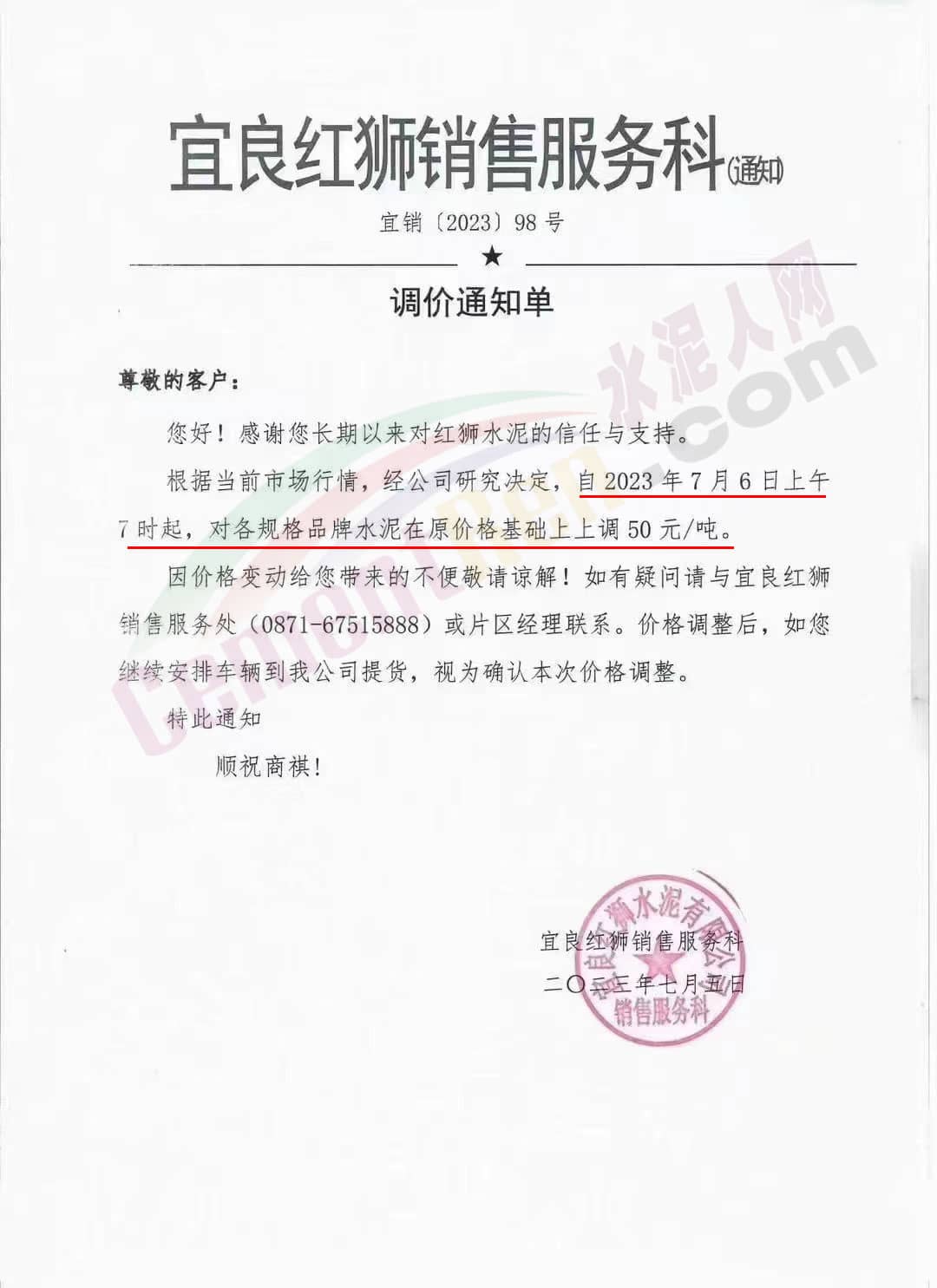 宜良红狮销售服务科通知,根据当前市场行情,经公司研究决定,自2023年7月6日上午7时起,对各规格品牌水泥在原价格基础上上调50元/吨。