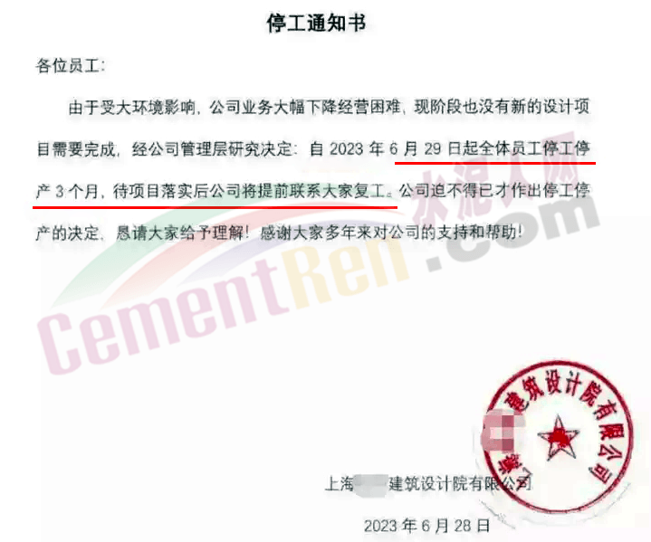 日前,上海某甲级设计院因为没有业务不得不宣告全体员工停工停产。企业通知书称,由于受大环境影响,公司业务大幅下降经营困难,现阶段也没有新的设计项目需要完成。经公司管理层研究决定,自2023 年6月29 日起全体员工停工停产3个月,待项目落实后公司将提前联系大家复工。公司迫不得已才作出停工停产的决定。