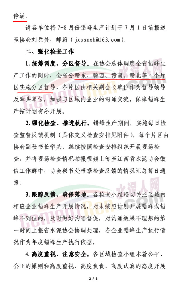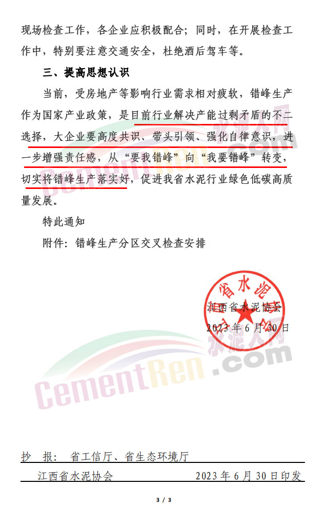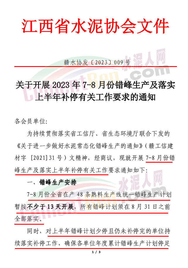 日前,江西省水泥协会通知全省在产 48 条熟料生产线将在7-8 月份统一错峰生产13天以上,通知文件提到,当前,受房地产等影响行业需求相对疲软,错峰生产作为国家产业政策,是目前行业解决产能过剩矛盾的不二选择,大企业要高度共识、带头引领、强化自律意识,进一步增强责任感,从“要我错峰”向“我要错峰”转变切实将错峰生产落实好。