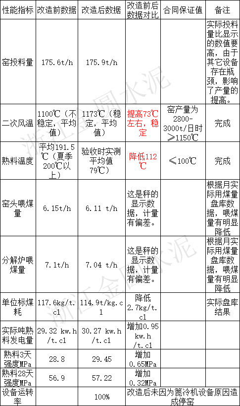 改造施工工程历时30 天,经过一段时间的运行及调试消缺,该设备运转正常,各工艺参数稳定,目前窑产量能连续稳定达到2800-3000T/D(因其它因素的影响,提产方面尚有瓶颈),取得的节能指标十分明显。经金圆水泥设备部、生产部、安环部等大半年的运行评审与考核,所有改造的预期目标全部达到,实际运行指标均超过合同考核标准。