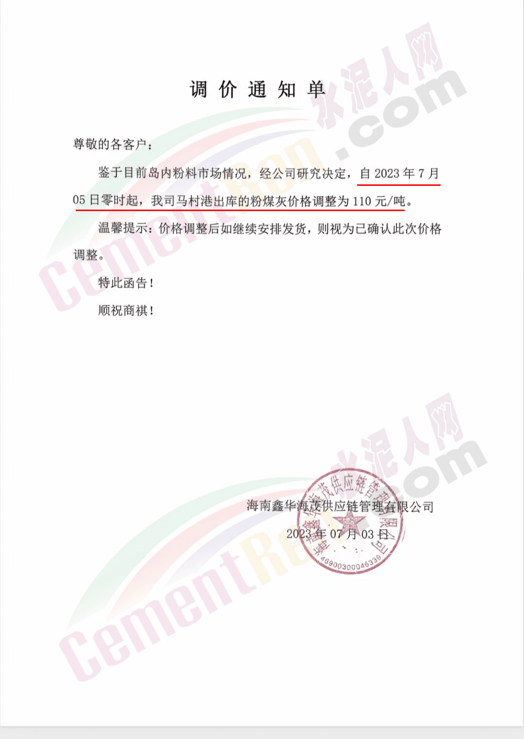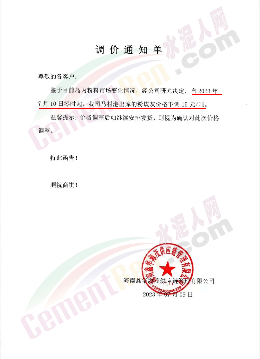日前,企业通知鉴于目前岛内粉料市场变化情况,经公司研究决定,自2023 年7月10日零时起,马村港出库的粉煤灰价格下调 15 元/吨,下调后粉煤灰报价95元/吨,同期下调矿渣粉报价30元/吨。