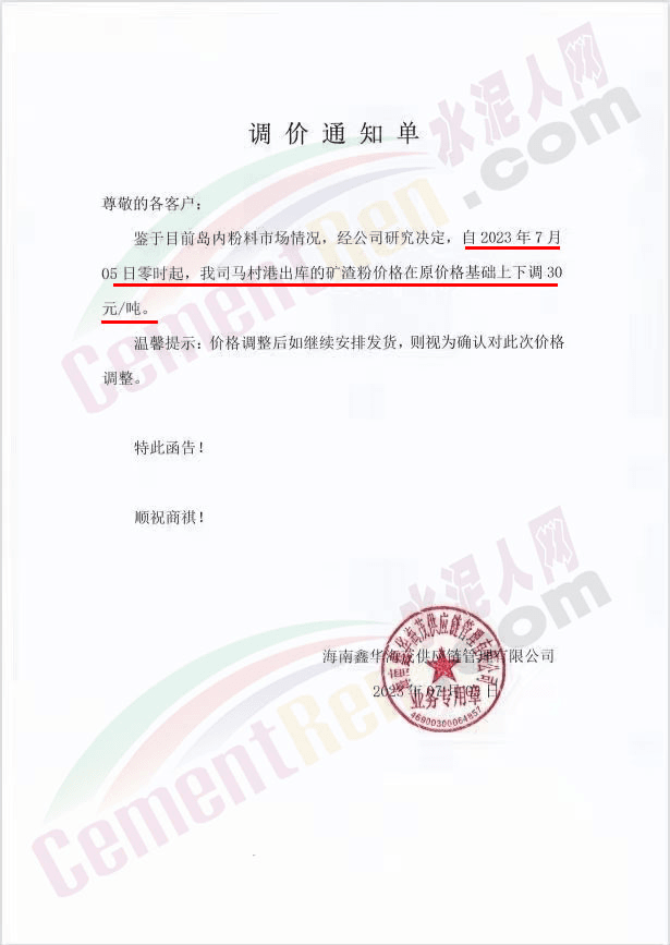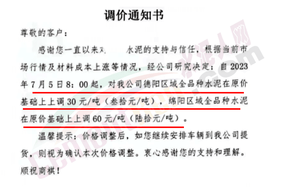 “天涯‘牌水泥通知,自2023年7月8日零时起所有品种水泥在出厂价格基础上上调30元/吨,同期调整粉煤灰及矿渣粉报价。
