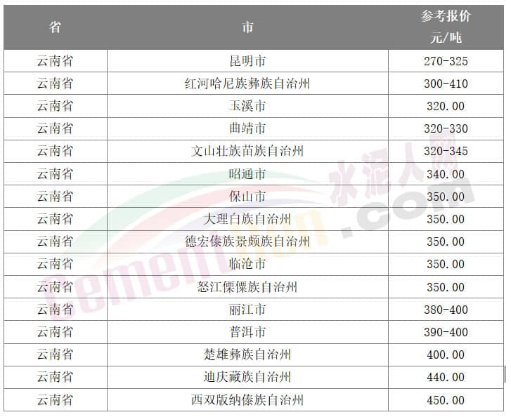 据水泥人网了解,或因云南省内各区域错峰生产执行力度不同,各区域水泥差价较大,低价水泥对多地市场都有冲击。水泥人网信息中心监控数据显示,目前云南省内参考报价在270-450元/吨,昆明区域P.O42.5散装水泥报价在270-325元/吨不等,不同企业最大差价在55元/吨左右。