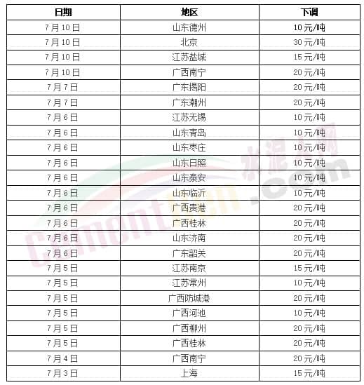 如与四川省相邻的重庆和贵州地区,不仅未受四川涨价影响反而出现下跌行情。7月10日,贵州遵义市场部分主流品牌散装P.O42.5水泥报价下调20元/吨;重庆水泥市场价格下调30元/吨 。