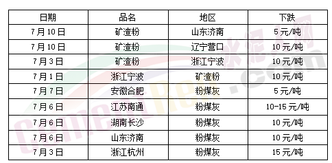 同期山东、江苏、安徽、浙江、湖南多地矿渣粉及粉煤灰也处于下跌行情。