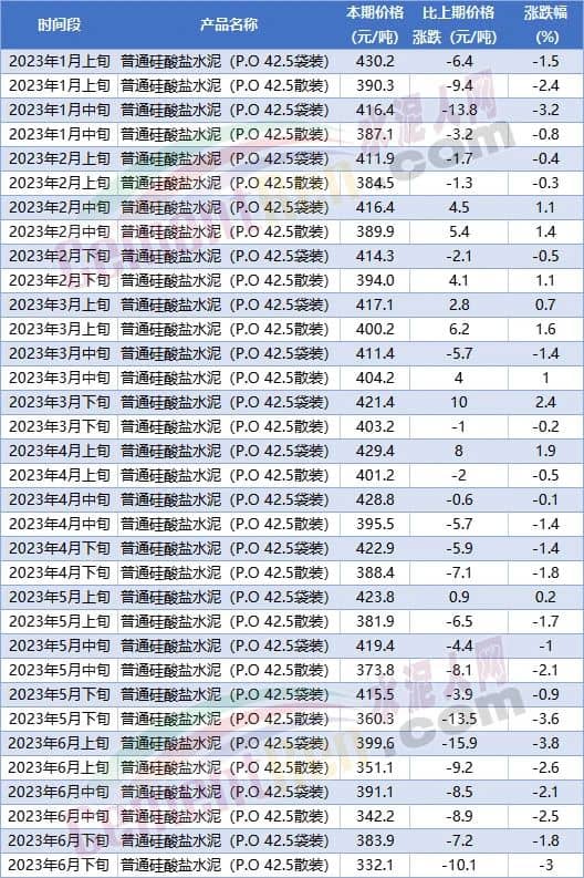 从国家统计局近期发布的6月下旬流通领域水泥报价可见,P.O42.5散装水泥报价报价332.1元/吨,较1月上旬报价390.3元/吨下跌58.2元/吨,跌幅17.52%。