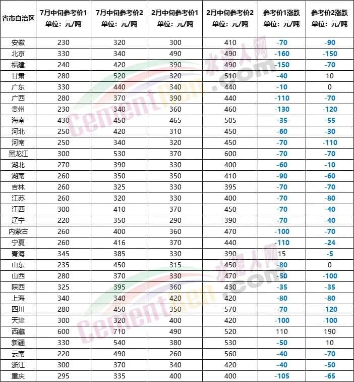 对比今年2月中旬以来各区域水泥价格涨跌情况可见北京、福建、广西、贵州、内蒙古、宁夏、天津、重庆、河南、山东、四川等10多个省市地区水泥价格出现100元/吨以上的下跌。