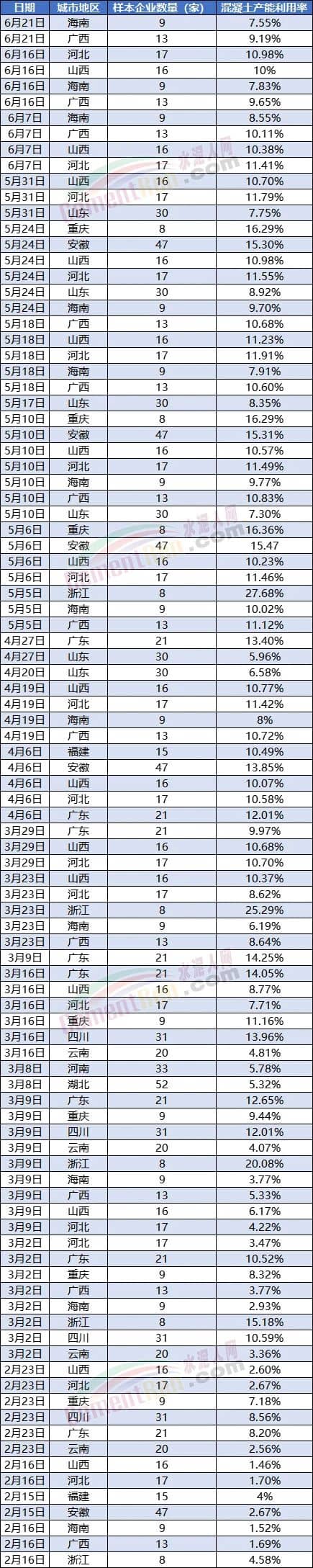 相比较而言,浙江区域混凝土产能利用率相对较高,却也只在15.18%~27.68%之间。绝大多数地区混凝土产能利用率仅在10%左右。