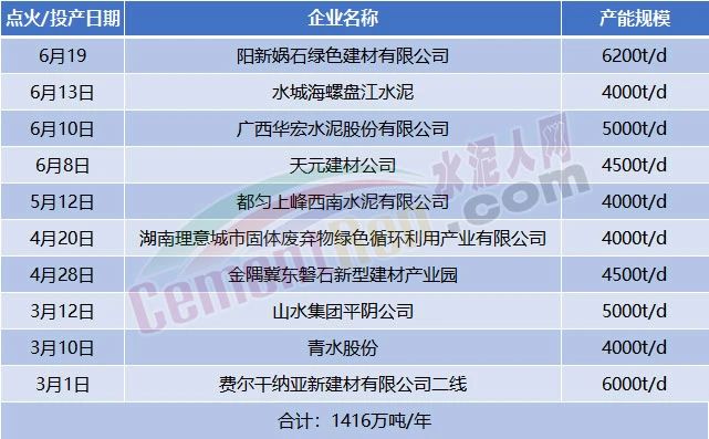 同期投产的粉磨生产线有,4月14日,北海鱼峰2#水泥磨投料试运行。2月13日,平阴山水水泥窑协同城市生活垃圾处置项目投产。