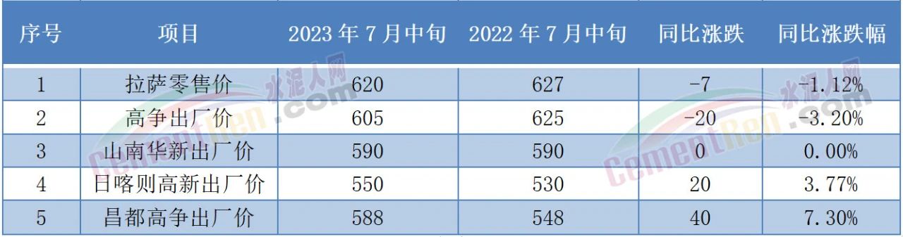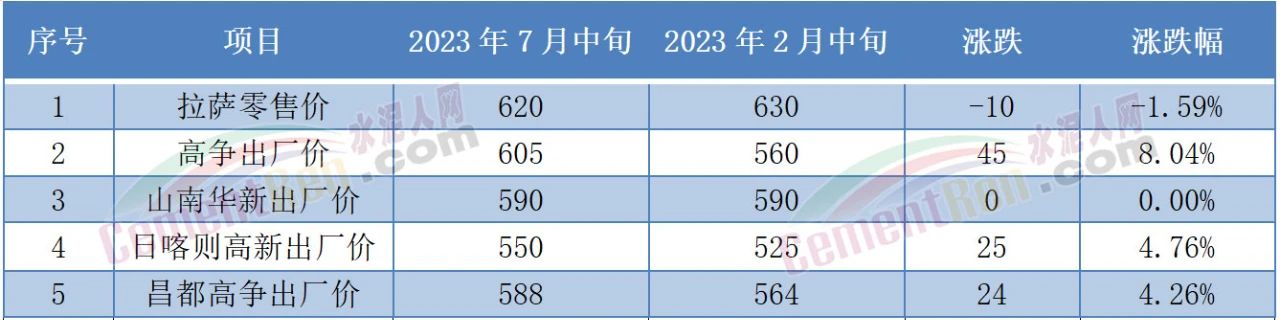 对比今年2月中旬报价除零售价格略有下跌,山南华新出厂价持平外,其他企业出厂价均有不同幅度上涨。