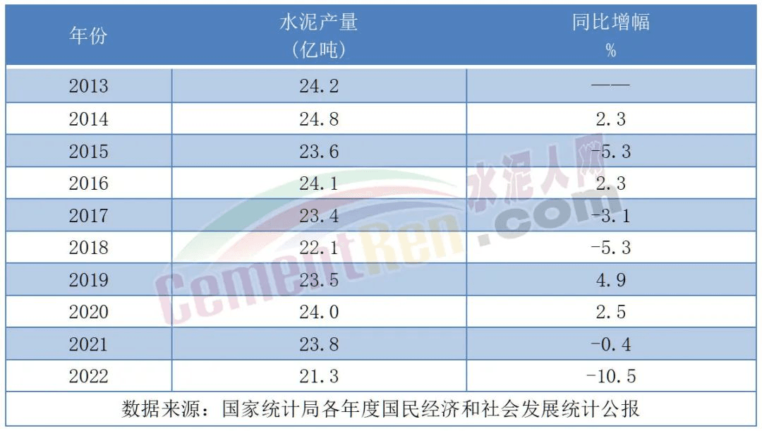 从近几年国家统计局发布的数据来看,全国水泥产量在2014年达到高位后开始回落。2022年全国水泥产量21.3亿吨,同比下降10.5%,创下近十年来的最大跌幅。