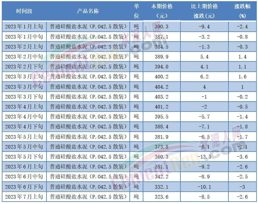 价格方面,突破近5年同期新低。近期公布的2023年7月上旬P.O42.5散装水泥报价323.6元/吨,同比上年同期377.8元/吨下跌54.2元/吨,跌幅14.35%。相比今年1月上旬下跌66.7元/吨,跌幅17.09%。