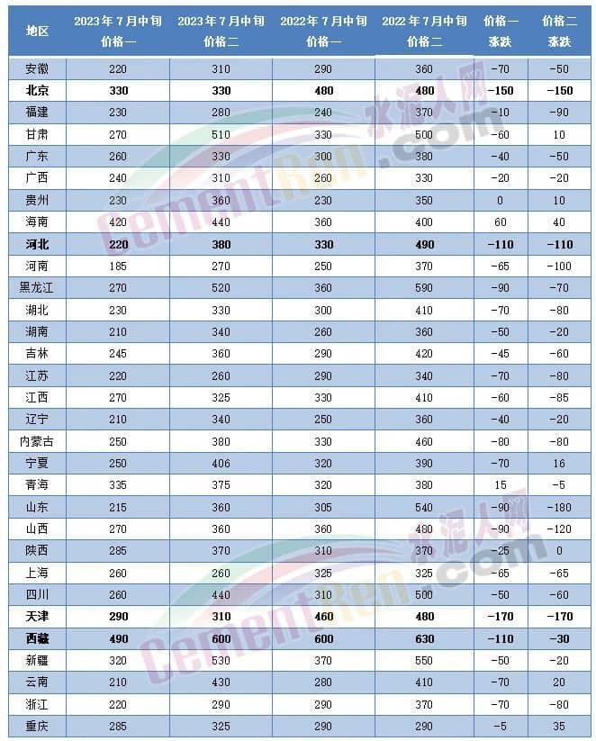 从水泥人网信息中心重点监控的600多家企业近期报价来看,同比上年同期,北京、天津、河北、西藏等区域均有超过100元/吨的下跌。其中天津市7月中旬报价290~310元/吨,较上年同期460~480元/吨报价下跌达170元/吨。