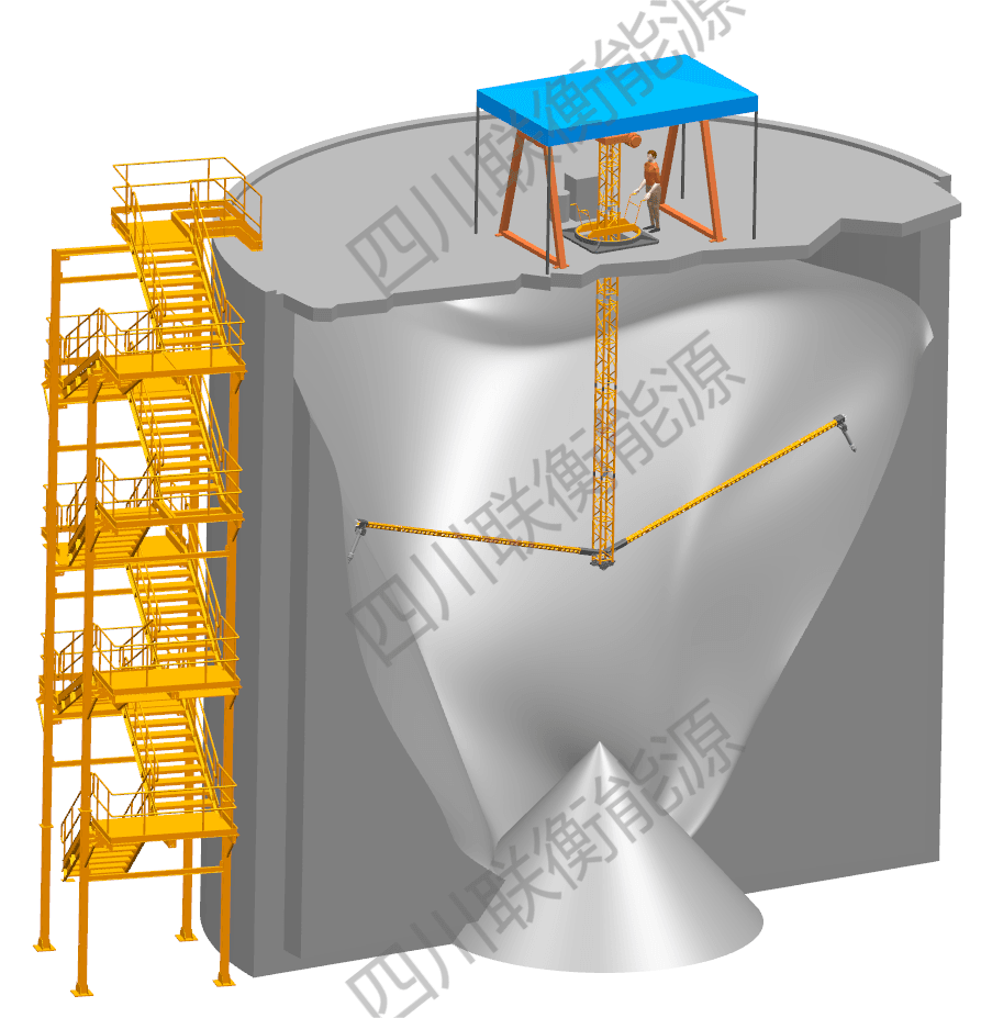 高比强度材料和机械臂构型设计,解决了设备自重和大空间部署的矛盾。只需在水泥库顶近中央部3米范围内开孔1米,即可安装设备入库清理。模组化机械臂可适应各尺寸水泥库。