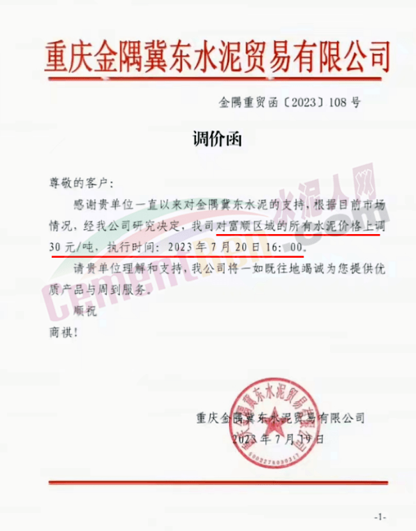 近日重庆金隅冀东水泥贸易有限公司根据目前市场情况,经公司研究决定,对隆昌、富顺区域的所有水泥价格上调30元/吨,执行时间分别为2023年7月21日12时和16时。