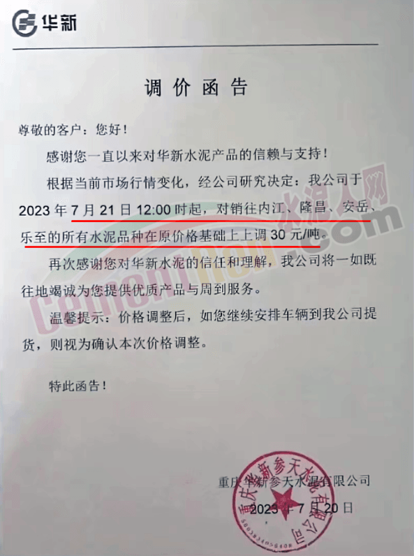 重庆华新参天水泥有限公司通知,根据当前市场行情变化,经公司研究决定,公司于2023年7月21日12时起,对销往内江、隆昌、安岳、乐至的所有水泥品种在原价格基础上上调30元/吨。