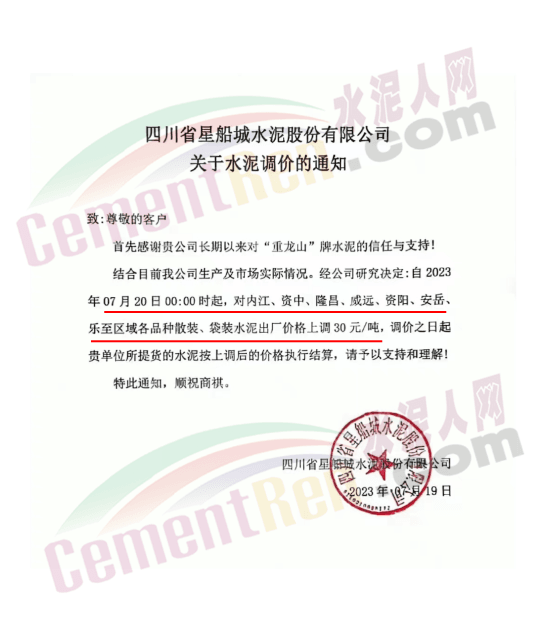 日前,四川省星船城水泥股份有限公司通知,结合目前公司生产及市场实际情况。经公司研究决定自7月20日0时起,对内江、资中、隆昌、成远、资阳、安岳、乐至区域各品种散装、袋装水泥出厂价格上调30元/吨。