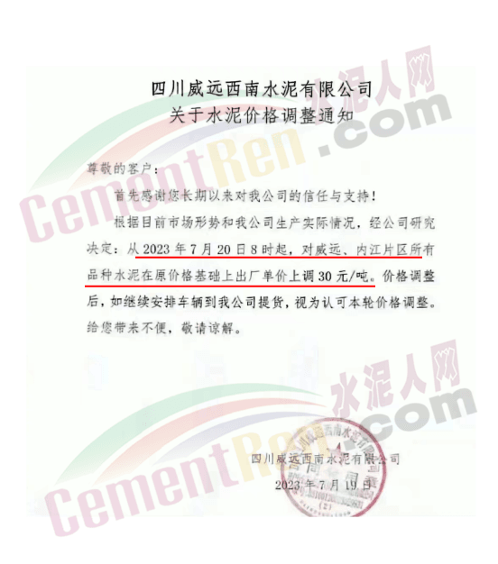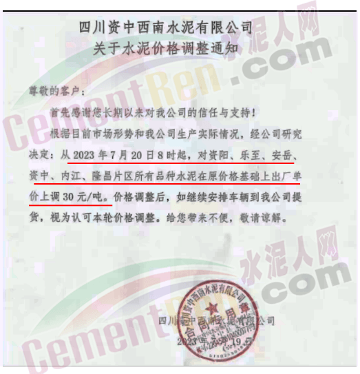 四川资中西南水泥通知,从2023年7月20日8时起,对资阳、乐至、安岳、资中、内江、隆昌片区所有品种水泥在原价格基础上出厂单价上调 30元/吨。