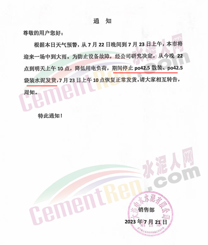 日前大连山水水泥又通知,根据天气预警,从7月22日晚间到7月23日上午,大连市将迎来一场中到大雨。为防止设备故障,经公司研究决定,从当晚22点到次日上午10点,降低用电负荷,期间停止P.O42.5散装和P.O425袋装水泥发货。