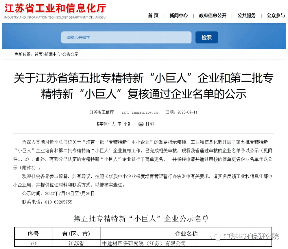 近日,根据工业和信息化部统一部署,江苏省工业和信息化厅发布了《关于江苏省第五批专精特新“小巨人”企业和第二批专精特新“小巨人”复核通过企业名单》,经公示后,中建材环保研究院(江苏)有限公司凭借创新能力强、质量效益优、行业地位高等竞争力被认定为国家级专精特新“小巨人”企业。
