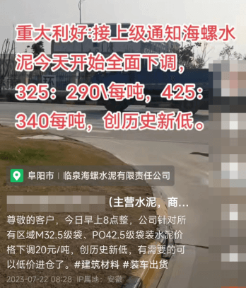 日前,安徽阜阳一贸易商通知:“临泉海螺通知公司针对所有区域M32.5级袋、PO42.5级袋装水泥价格下调20元/吨,创历史新低,有需要的可以低价进仓了 ”。本轮调价后,临泉海螺M32.5袋装水泥报价290元/吨,P.O425级袋装水泥报价340元/吨。