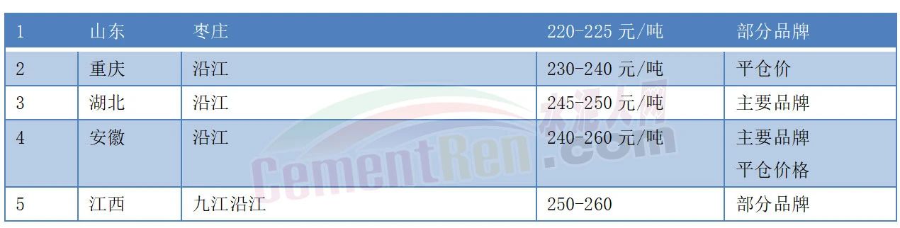 熟料价格方面山东枣庄及重庆、湖北、安徽、江西沿江熟料报价多在220-260元/吨之间。
