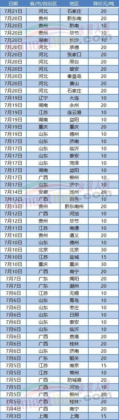 另据了解,在管理费用,技改支出增加,但市场价格却跌跌不休的情况下,有部分企业已在亏本销售。尽管如此,市场降价信息仍不断涌来。7月份以来河北、河南、山东、广东、广西、江苏、安徽、湖南、辽宁、重庆、贵州等10多个区域水泥价格仍处于下行态势。