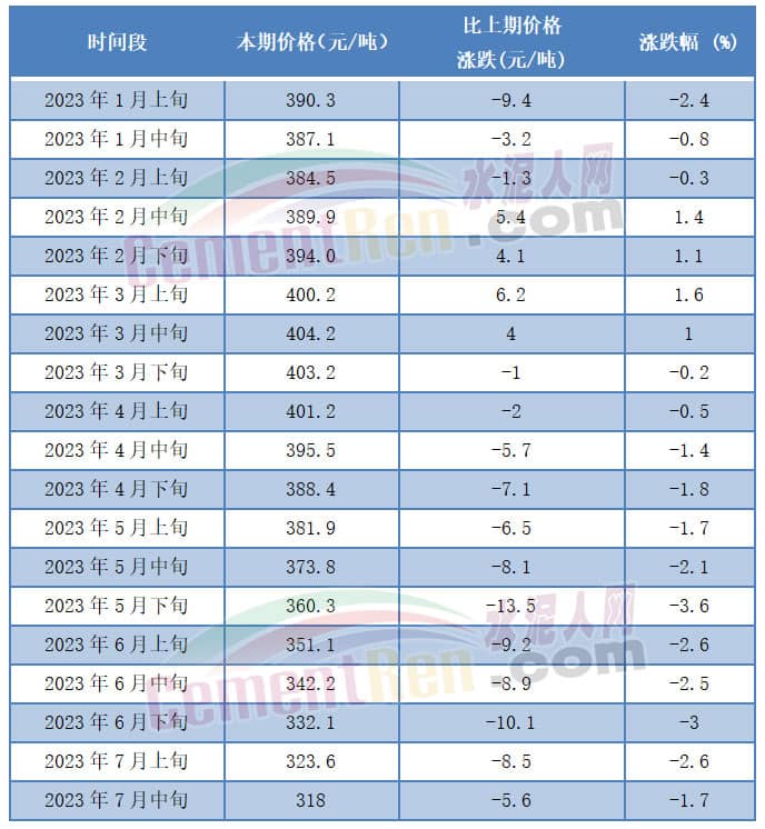 2023年7月中旬流通领域普通硅酸盐水泥(P.O 42.5)散装水泥报价318元/吨,同比上年同期下跌54.2元/吨,跌幅14.34%。