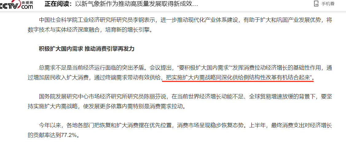 近日,国家下半年经济会议召开,针对国内经济疲软,给出救市方案,会议强调,要积极扩大国内需求,发挥消费拉动经济增长的基础性作用,通过增加居民收入扩大消费,通过终端需求带动有效供给,把实施扩大内需战略同深化供给侧结构性改革有机结合起来。